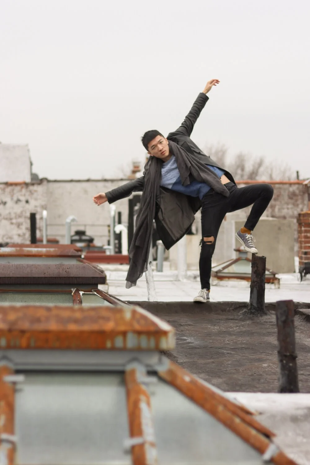 | Image Description: Jiajia Wu, an Asian male with short black hair, wears a dark green jacket and black tight jeans with gray Converse sneakers. Standing on an urban rooftop, he leans over pendulously with arms open wide and balances himself on one foot with another on a vent pipe. |